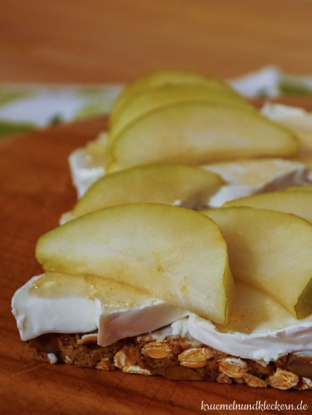 Also habe ich leckeres Vollkornbrot getoastet und mit Ziegenfrischkäse beschmiert. Danach wurde die Stulle noch mit einer anderen Sorte Ziegenkäse belegt und auf diese Stückchen kam die wundervolle Birnensenfsauce. Zum Schluss noch Birnenscheiben oben drauf gelegt und fertig ist die Stulle.